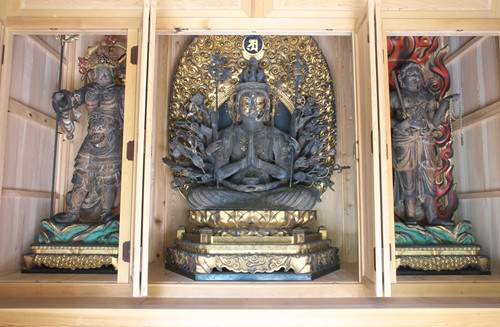 三尾寺の本尊である木造千手観音坐像は(中央)、行基自らが彫刻したといわれており、戦乱により焼失した伽藍が1559(永禄2)年に再建された際に安置されたと伝わっています。千手観音を中心にして、像に向かって左に毘沙門天、右に不動明王を配した三尊形式の仏像です。檜材の寄木造りで、鎌倉時代中期作と考えられています。