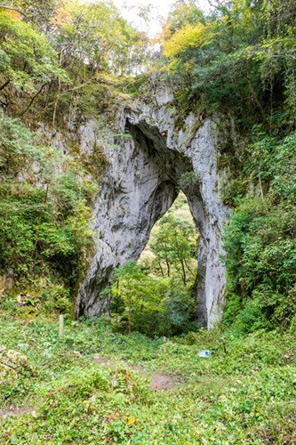 羅生門は、標高約400mの草間台のドリーネにできた石灰岩の巨大なアーチで、古い鍾乳洞が崩落し、一部分が残存してアーチとなった鍾乳洞の最後の姿です。