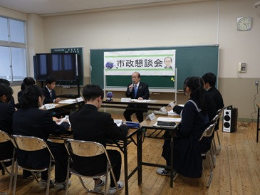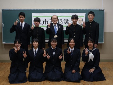 哲西中学校生徒会の皆さんと「おでかけ市長室」を開催しました。「ふるさと新見の活性化と将来の姿」と題して、本市の情報発信や新見高校の魅力化などについて懇談しました。