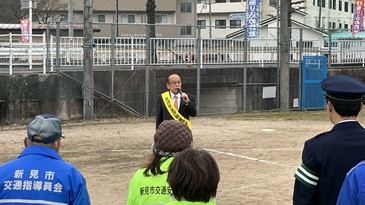年末年始の交通安全意識を高めるため、新見市内高等学校生徒指導連絡協議会をはじめとする皆さんと一緒にパンフレットなどを配布し、後部座席を含むシートベルト、チャイルドシートの着用指導、飲酒運転根絶、安全運転の呼び掛けなどを行いました。