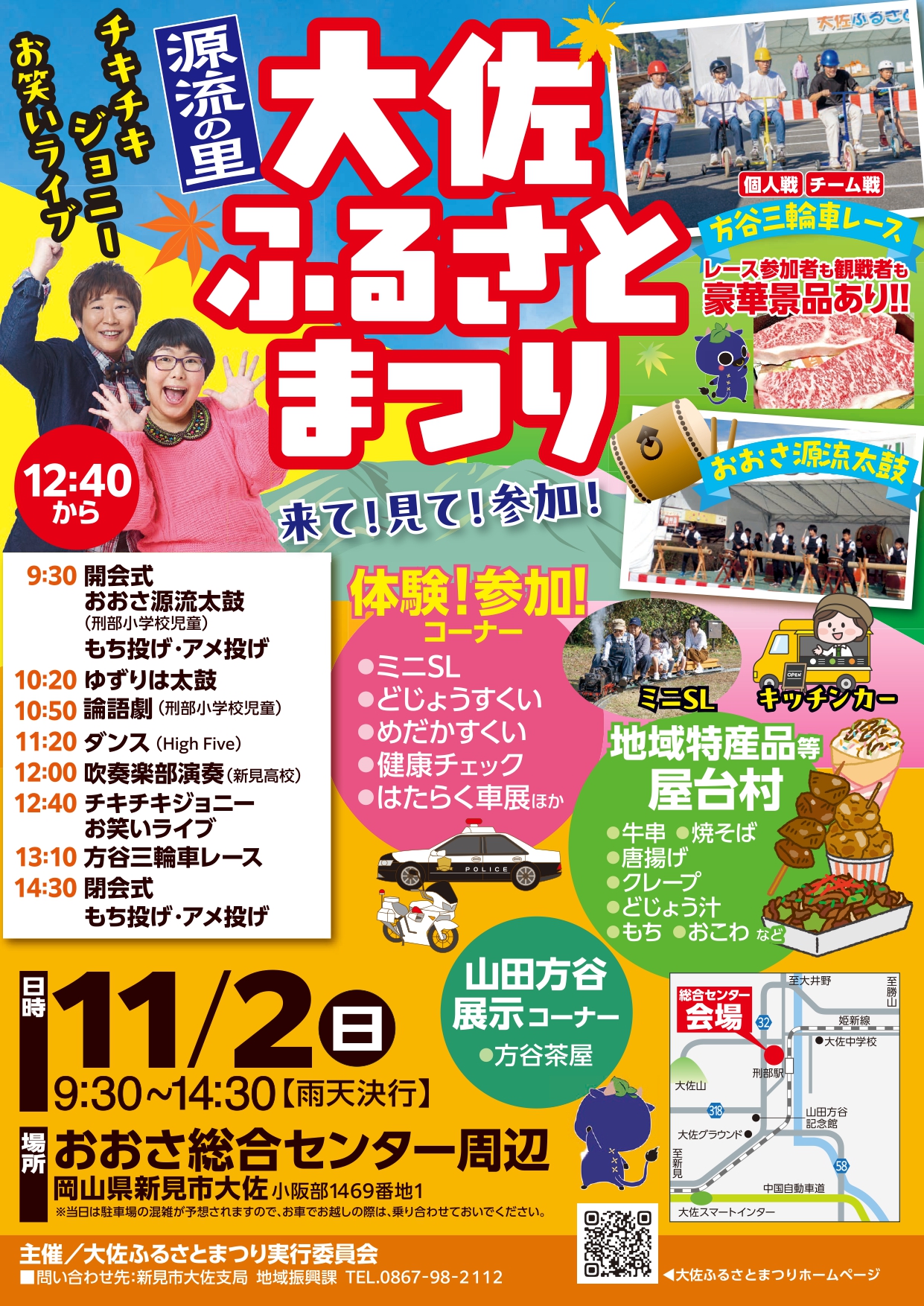 11月2日(日)に、おおさ総合センター周辺にて「源流の里 大佐ふるさとまつり」開催!地元小学生による源流太鼓や論語劇、チキチキジョニーのお笑いライブや新見高校吹奏楽部による演奏などの野外ステージイベントのほか、もち投げ、方谷三輪車レース、どじょうすくい、めだかすくいなどの参加体験コーナーや、地域特産品などの屋台村、キッチンカーマルシェなど盛りだくさんのイベントとなっております!