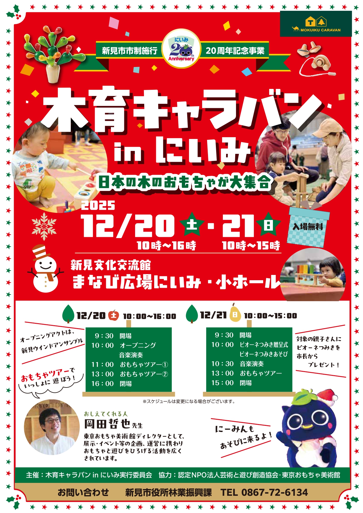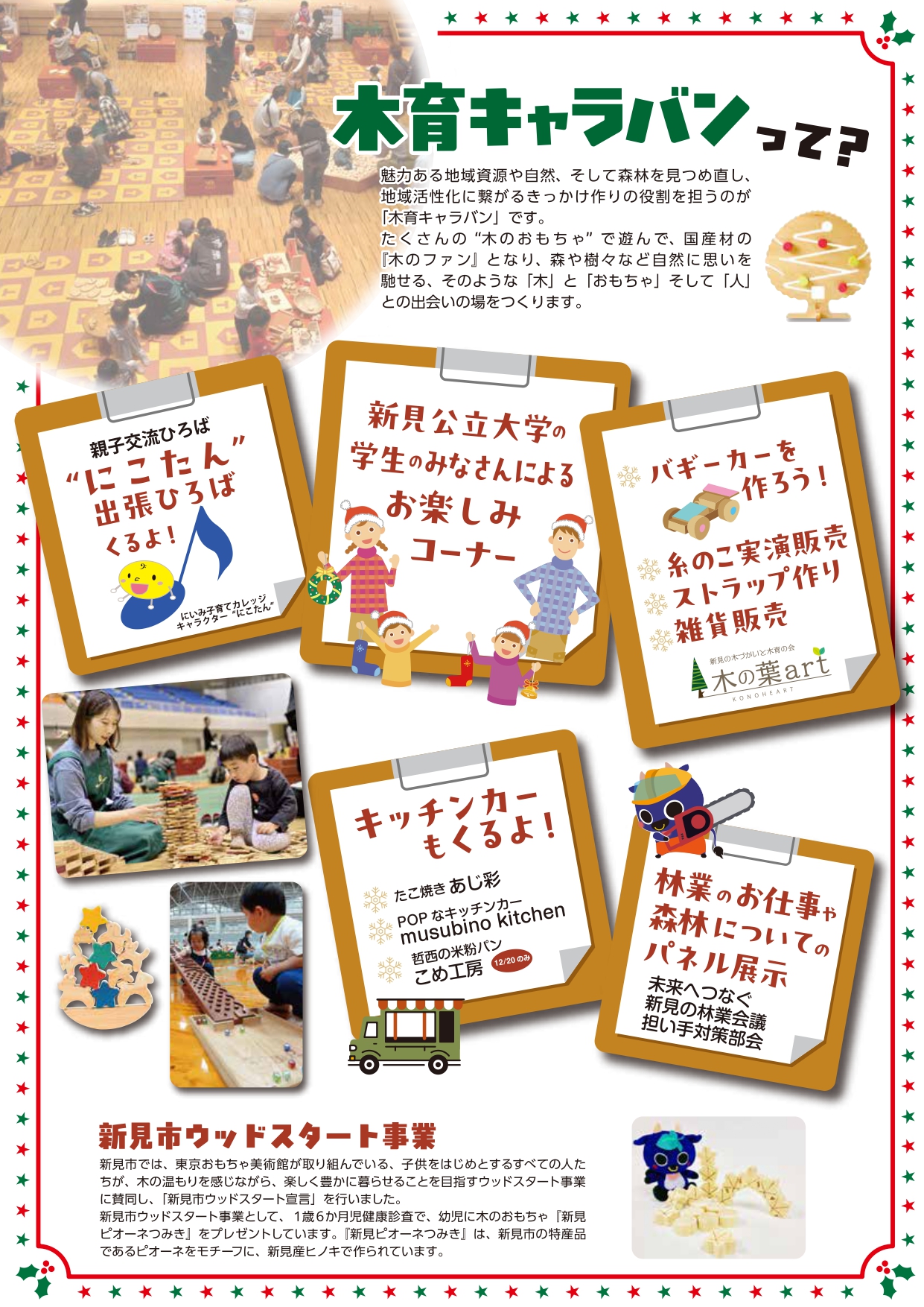 市制施行20周年を記念して、木のぬくもりや香りを感じながら、木のおもちゃで自由に遊べる「木育キャラバン」を県内では8年ぶりに、新見市では初めて開催します!!子どもから大人まで楽しめる催しが盛りだくさんのイベントですので、ぜひご来場ください!