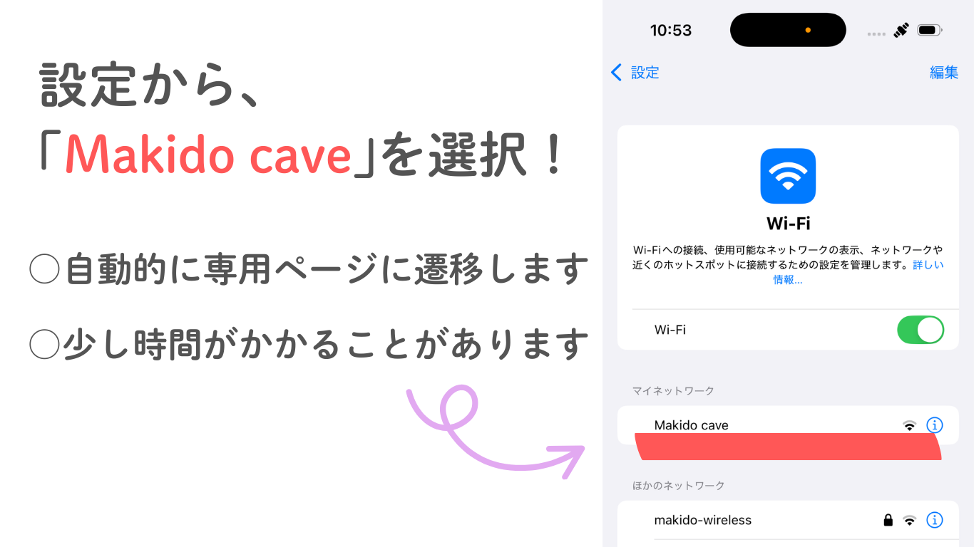 ご自身のスマートフォン等の端末の設定画面から「Wi-Fi」を開き、「Makido cave」を選択してください!