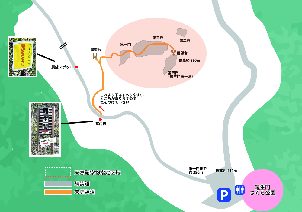 高さ約40mの圧巻の姿「羅生門」は知る人ぞ知るパワースポット!春には様々な桜が咲き乱れる「さくら公園」もあります!