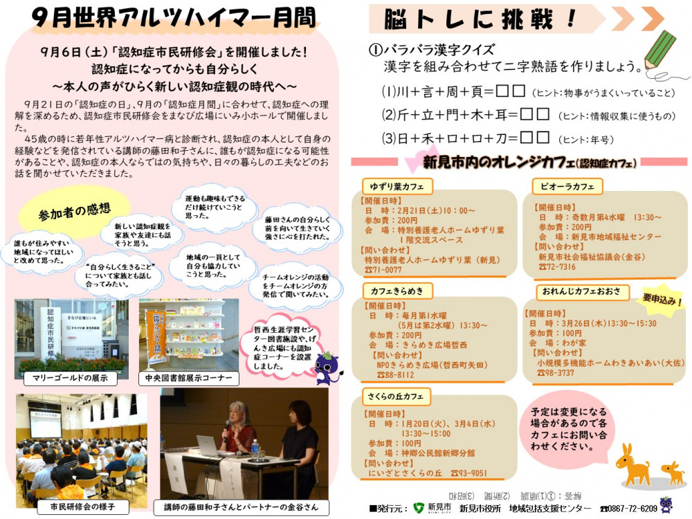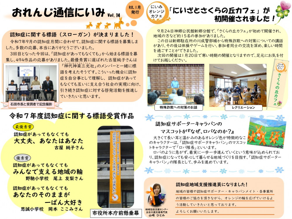 市内で開催されている「にいみオレンジカフェ」の情報、活動の紹介を中心に、認知症地域支援推進員からのお知らせなどを掲載し、年に3回程度発行しています。最新号(令和8年1月発行)