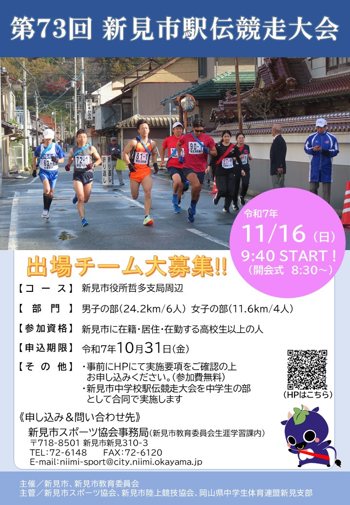 11月16日(日)に新見市役所哲多支局周辺(新見市哲多町本郷)で、「第73回新見市駅伝競走大会」を開催します。