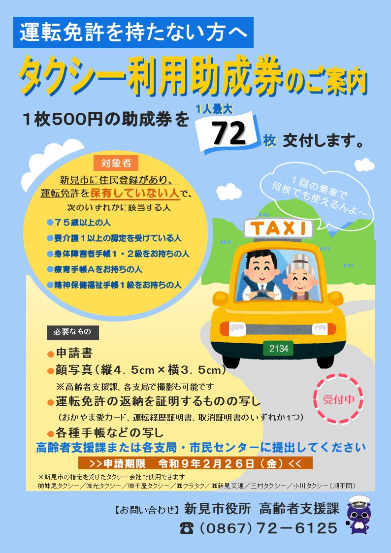 ※助成券を利用し乗車する場合は、「タクシー利用者証」と「タクシー利用助成券」を必ず持参してください。