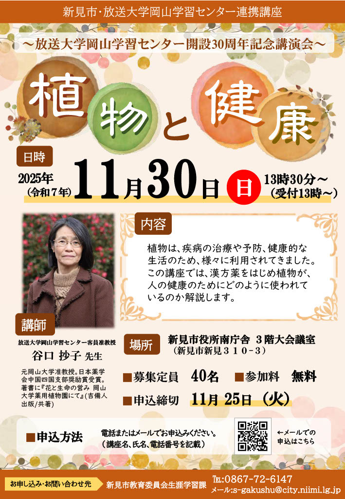 漢方薬をはじめ植物がどのように健康のために使用されているのか学ぶ、新見市・放送大学岡山学習センター連携講座「植物と健康」を 開催します。