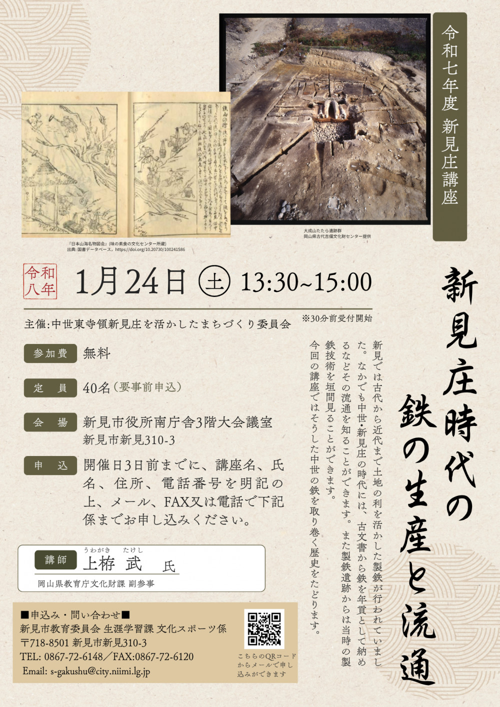①講座名「新見庄講座」、②氏名、③住所④電話番号を記入の上、メール、FAX、電話などでお申し込みください。■申し込み・問い合わせ先