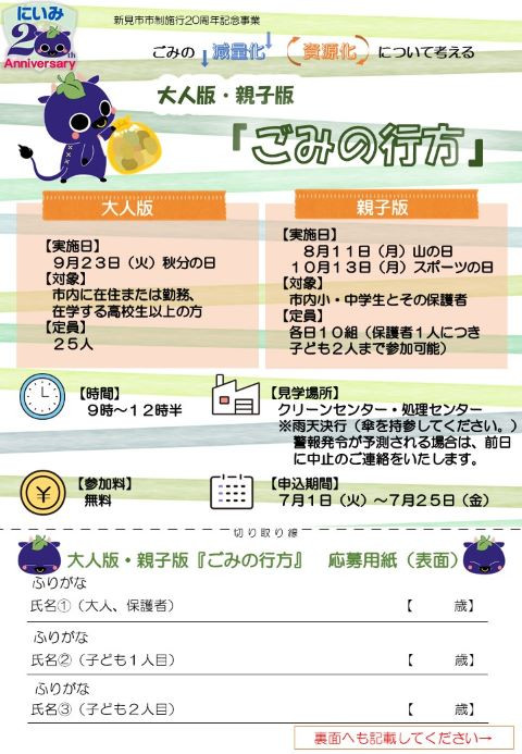 小学4年生を対象に行っている環境教育学習「ごみの行方」を市制施行20周年記念事業として、大人や親子を対象に実施しました。日 時