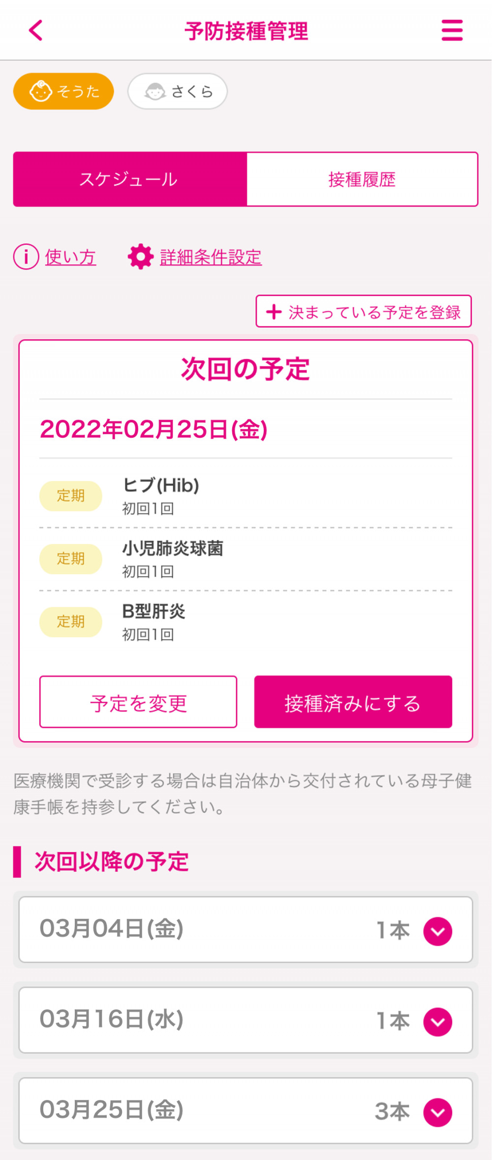接種予定日が近づくと、事前にプッシュ通知でお知らせすることができます。