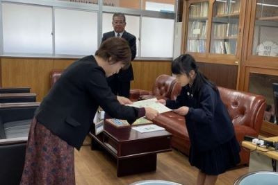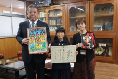 11月18日に新見南小学校校長室で、小学生の部で最優秀賞を受賞した4年生の林 千早希さんの表彰を行いました。当日は、市民生活部長から賞状や記念品を授与しました。
