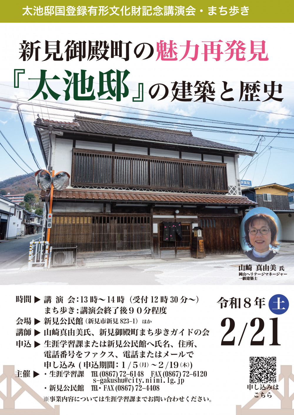 太池邸(新見市新見)が、令和7年11月17日に国登録有形文化財(建造物)に文化財名:旧太池呉服店店舗兼主屋(大正2年建築)として登録されました。それを記念して歴史的建造物の専門家による講演会と現地説明及びまち歩きを行います。