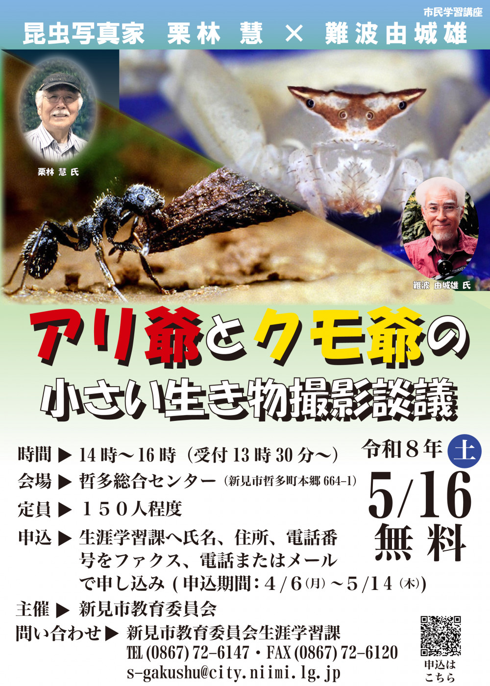 市民学習講座「昆虫写真家 栗林慧×難波由城雄 アリ爺とクモ爺の小さい生き物撮影談議」を開催します!