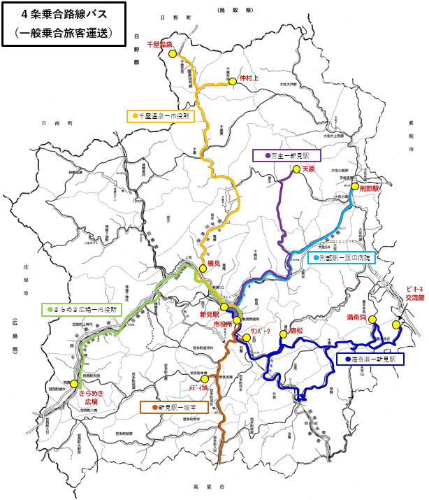 | 新見 | 月 | ●(☆)寺下・木の畝線 ●(☆)指野線 ●(☆)吉野河内線 ●(☆)黒谷線 |