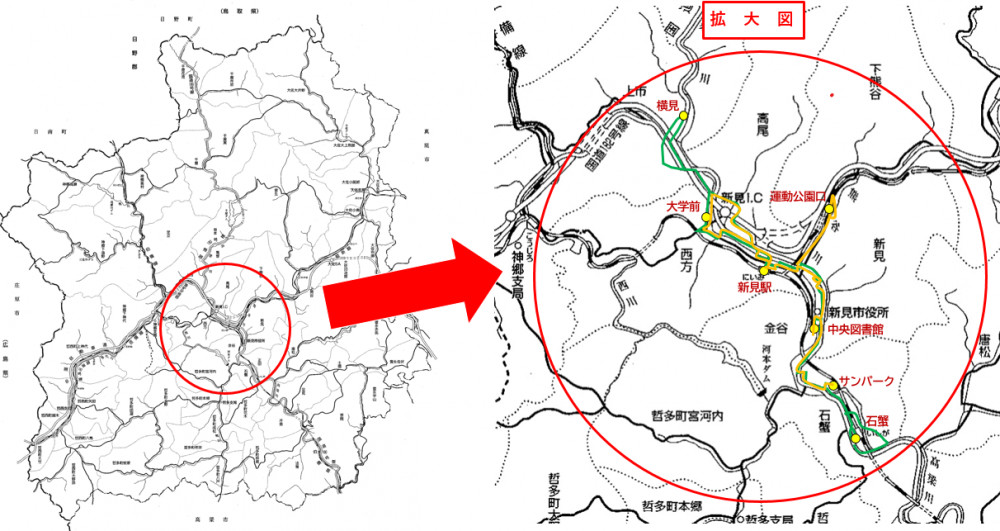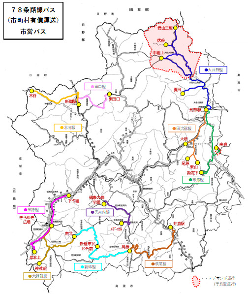 | 哲多地域 (宮河内線、荻尾線、新砥線) | 哲西地域 (大野部線、矢神線) |