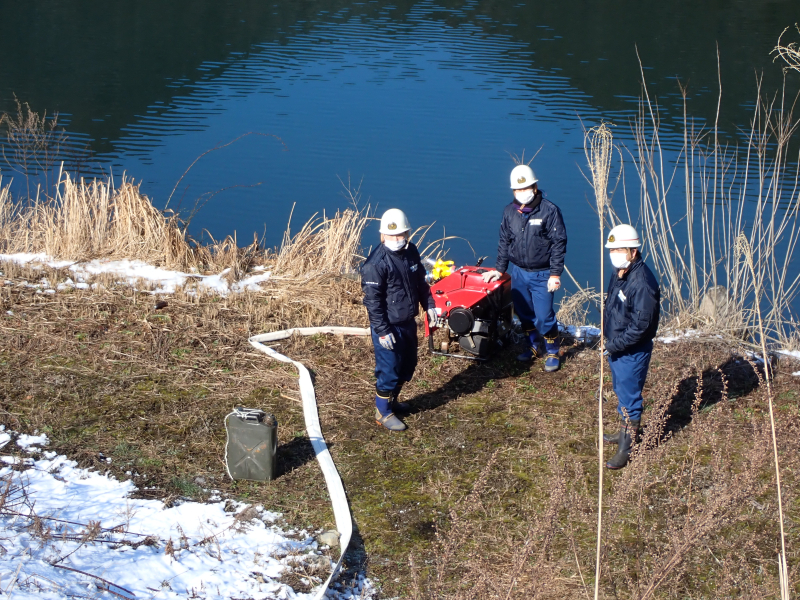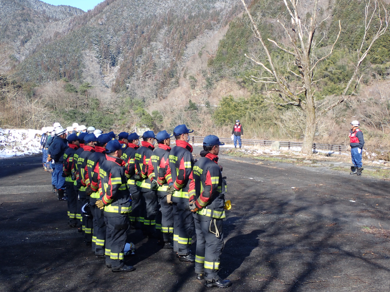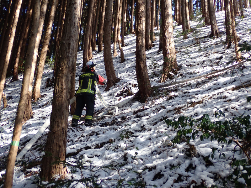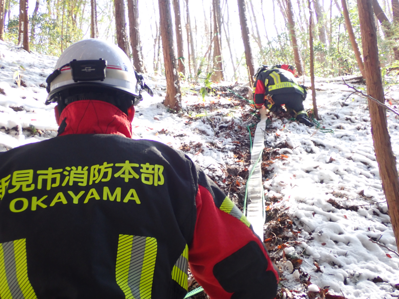 訓練は阿福トンネル付近の山林で火災が発生したと想定し、千屋ダム付近の高梁川から揚水し消防ホースを延長、山頂付近の火点に向けて放水しました。現場は急斜面で身体的にも負担の大きい環境下でしたが、消防署員と消防団員で連携して訓練に臨めたことは非常に有意義な訓練となりました。今回の訓練を今後の活動に活かしていくことができるよう、引き続き訓練に励んでまいります。