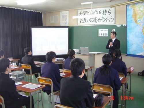 | 生徒たちが僅か1時間の授業で尾山先生の話を通して、どれくらいアフリカ系アメリカ人の公民権運動の歴史やオバマ大統領誕生の意義を理解してくれるか心配がありました。しかし、生徒たちは尾山先生の色々な体験談を交えユーモアのある話術に引きつけられて熱心に聞き入っていました。授業後のアンケートでは多くの生徒が、アフリカ系アメリカ人の差別の歴史や公民権運動のことがよく分かったと答えてくれました。最後に生徒が書いてくれたオバマ大統領へのメッセージを紹介します。 ●黒人が差別を受けていたのは知っていたけど、あれほどひどいものだとは知らなかった。オバマ大統領には今も残っている差別を無くしてほしい。オバマ氏が大統 領になったからといって、白人の意識は簡単には変わらないと思うが、いつかは必ず完全に平等になると思うので頑張ってほしい。 ●昔、奴隷として差別された時代を考えると、今、オバマさんがアメリカの大統領になっていることは本当にすごいことなんだぁと思った。これからはアメリカの住人みんなが安全で安心した生活ができるようにしてほしい。様々のことに取り組み、アメリカをよりよい国にしてほしい。 ●オバマ大統領はすごいなぁと思っていたけど、今日の授業で詳しく勉強して改めてとてもすごい人だと思った。これからも頑張ってほしいと思った。 「YES,WE CAN] |